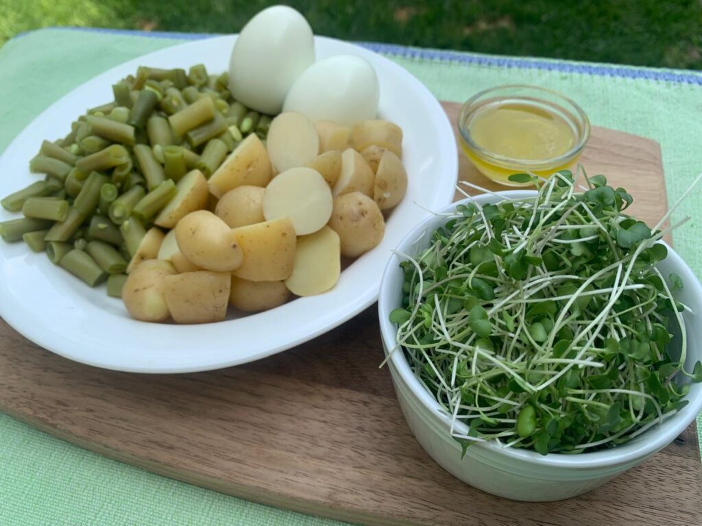 - Arma la ensalada: En un tazón grande, combina los brotes de brócoli, las papas, los ejotes y los huevos cocidos.